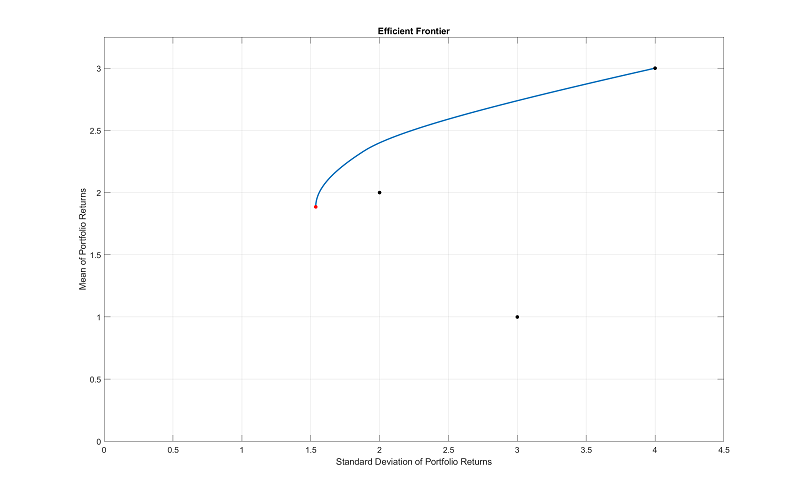 I punti neri identificano i titoli, quello rosso il portafoglio di minima varianza mentre la curva è la frontiera efficiente